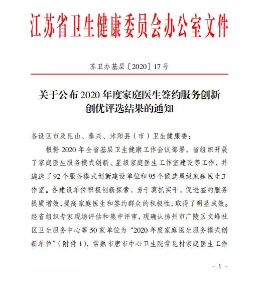 健康徐州网 徐州卫生信息:日前,江苏省卫健委在全省范围内组织开展的家庭医生签约服务创新创优评选工作结果出炉,徐州市累计建成达到省规范建设要求的家庭医生工作室117个,其中13个家庭医生工作室通过省星级工作室验收,2020年通过省级验收数量全省第一。