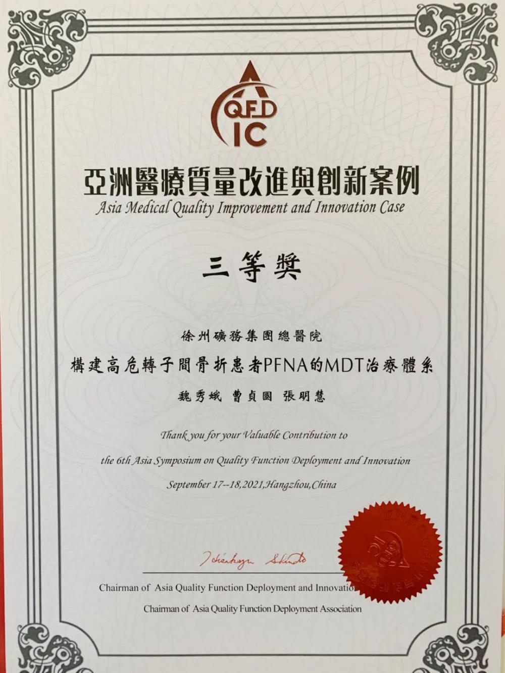 健康徐州网 矿总频道:近日,第六届亚洲质量功能展开与创新研讨会暨第六届亚洲质量改进与创新案例大赛在杭州举办。徐矿总医院《构建高危转子间骨折患者PFNA的MDT治疗体系》项目荣获亚洲医疗质量改进创新案例三等奖。